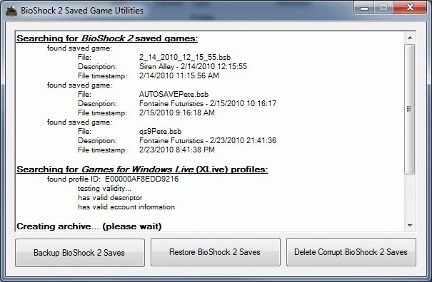Having recently been through the horrifying experience of nearly losing all of my saved progress in BioShock 2 using my offline profile, I wrote a utility that will allow you to create and restore backups of your offline saved games as well as share them with other people. Additionally, this utility can be used to clear out any corrupt saved game files that often prevent you from loading your saved games. ![]() Limitations On Use: This download is freeware. All features of this program are available for all to use freely. Liability: I maintain no liability or warranty for the use of this program in any situation. Download: Click here to download BioShock 2 Saved Game Utilities version 1.00 (421 KB). |